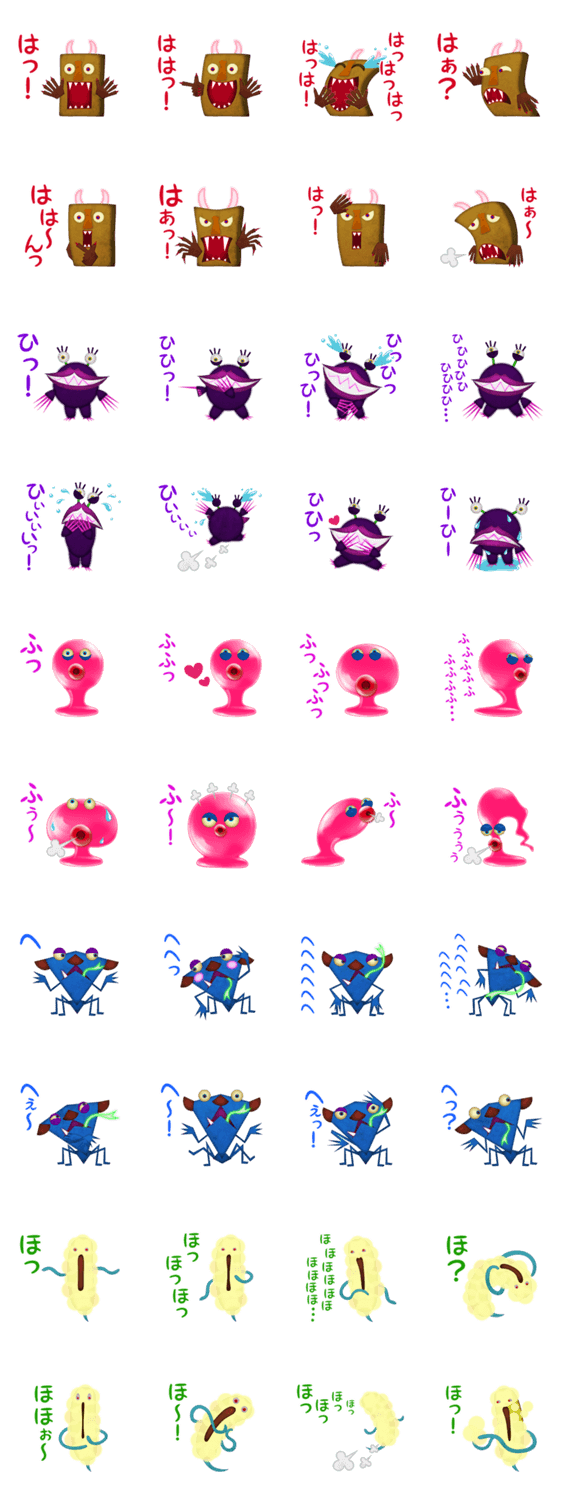 【は行】モンスター ブリッジクリエイト コメントをどうぞ は行「は・ひ・ふ・へ・ほ」だけでわき出る感情を表現したモンスターたちです。「はっ!」そういえば! 「ふぅ~」よかった ……微妙な使い分けで沢山の表現ができます♪ このスタンプどう思う?!↓クリックで投票♪好き (0)かわいい (0)かっこいい (0)おもしろい (0)使いやすそう (0)欲しい (0)萌え (0)ほっこりする (0)おしゃれ (0)ゆるい (0)こわい (0)ウザい (0)キモい (0)ムカつく (0)持ってる (0)癒される (0)セクシー (0)個性的 (0)私は買わない (0)誰かプレゼントして! (0) 購入・プレゼントする Facebookでシェア Twitterでシェア