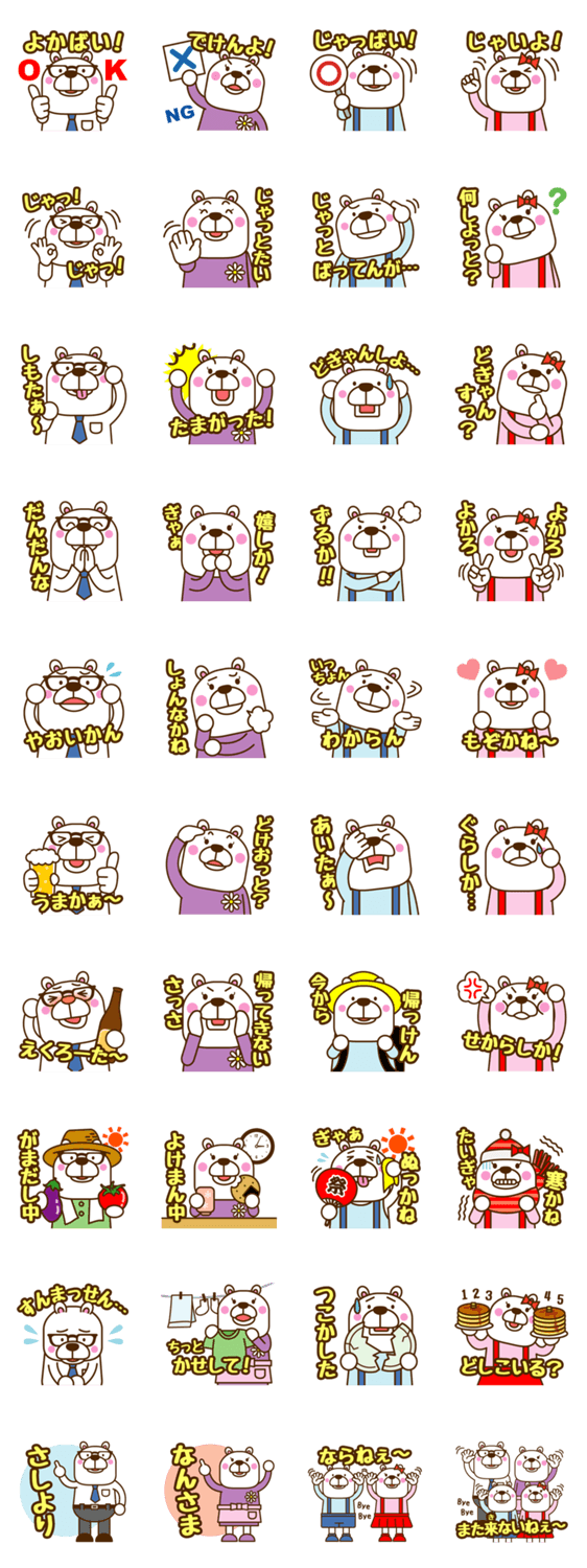 【球磨弁】しろくま家族 まぁーひゃん コメントをどうぞ 熊本県の南に位置する人吉・球磨地方の方言『球磨弁』を話すしろくま家族の日常会話で使えるスタンプです。福岡・佐賀・長崎など九州の方が使えるものもあると思います。 このスタンプどう思う?!↓クリックで投票♪好き (0)かわいい (0)かっこいい (0)おもしろい (0)使いやすそう (0)欲しい (0)萌え (0)ほっこりする (0)おしゃれ (0)ゆるい (0)こわい (0)ウザい (0)キモい (0)ムカつく (0)持ってる (0)癒される (0)セクシー (0)個性的 (0)私は買わない (0)誰かプレゼントして! (0) 購入・プレゼントする Facebookでシェア Twitterでシェア