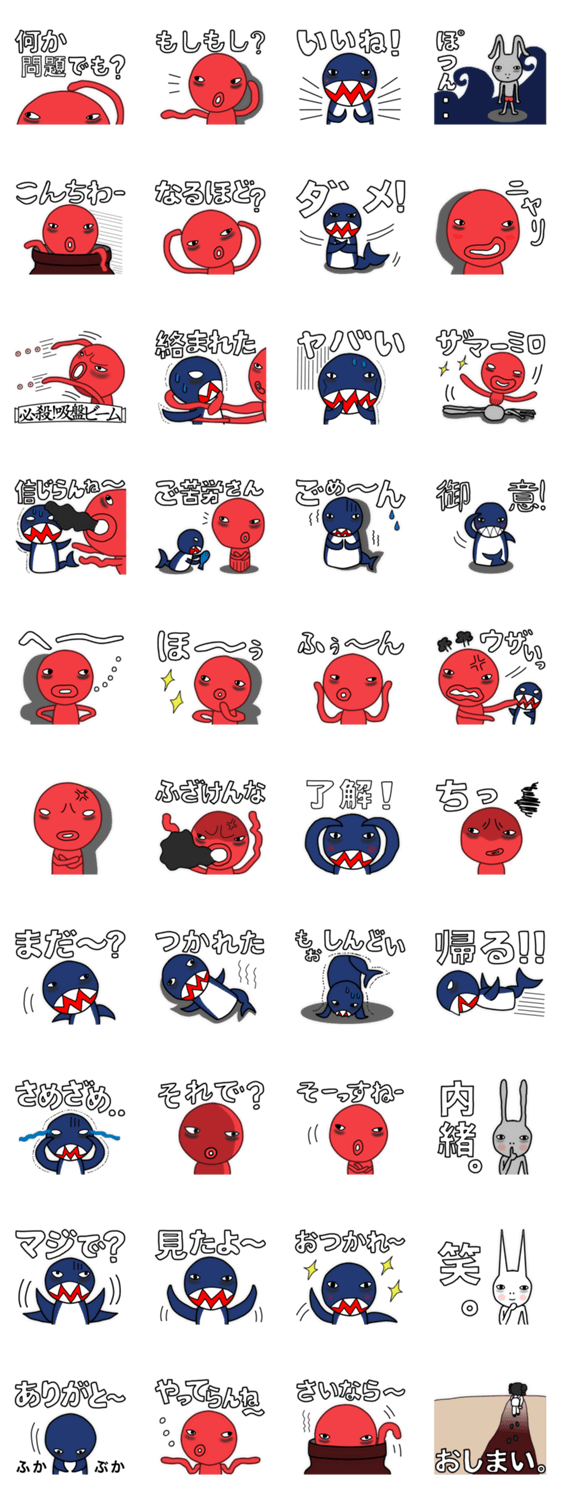 あくるとさめ時々うさぎ男 HonnoBonno コメントをどうぞ “うさぎ男”と”あくる(大タコ)”と”さめ”。ものがたりのキャストが繰り出すおもしろスタンプ。絵本クリエイター「HonnoBonno」スタンプ第一弾! このスタンプどう思う?!↓クリックで投票♪好き (0)かわいい (0)かっこいい (0)おもしろい (0)使いやすそう (0)欲しい (0)萌え (0)ほっこりする (0)おしゃれ (0)ゆるい (0)こわい (0)ウザい (0)キモい (0)ムカつく (0)持ってる (0)癒される (0)セクシー (0)個性的 (0)私は買わない (0)誰かプレゼントして! (0) 購入・プレゼントする Facebookでシェア Twitterでシェア