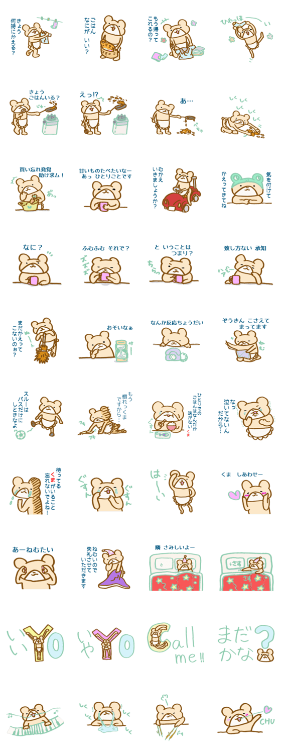 あなたの帰りを待つくま and_K コメントをどうぞ 家で大事な人の帰りを待つクマのスタンプです。旦那さんや彼氏のことを待つあなたの言葉をクマが代わりに言います。お母さん、彼女、妻、そしてくま。 このスタンプどう思う?!↓クリックで投票♪好き (0)かわいい (0)かっこいい (0)おもしろい (0)使いやすそう (0)欲しい (0)萌え (0)ほっこりする (0)おしゃれ (0)ゆるい (0)こわい (0)ウザい (0)キモい (0)ムカつく (0)持ってる (0)癒される (0)セクシー (0)個性的 (0)私は買わない (0)誰かプレゼントして! (0) 購入・プレゼントする Facebookでシェア Twitterでシェア