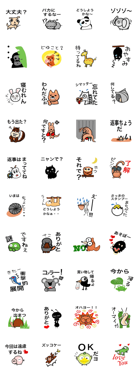 あにまるDEいこう よぴさん コメントをどうぞ 動物たちの世界。一部、生物が混ざっています。可愛くて、時々シュールなこの子達を色々な場面で使ってあげて下さいね。 このスタンプどう思う?!↓クリックで投票♪好き (0)かわいい (0)かっこいい (0)おもしろい (0)使いやすそう (0)欲しい (0)萌え (0)ほっこりする (0)おしゃれ (0)ゆるい (0)こわい (0)ウザい (0)キモい (0)ムカつく (0)持ってる (0)癒される (0)セクシー (0)個性的 (0)私は買わない (0)誰かプレゼントして! (0) 購入・プレゼントする Facebookでシェア Twitterでシェア