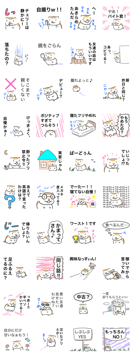 いじわるハムス ゆきち先生 コメントをどうぞ あまり言われたくないことをあえて言ってくるハムスターです。名前はゴル。 このスタンプどう思う?!↓クリックで投票♪好き (0)かわいい (0)かっこいい (0)おもしろい (0)使いやすそう (0)欲しい (0)萌え (0)ほっこりする (0)おしゃれ (0)ゆるい (0)こわい (0)ウザい (0)キモい (0)ムカつく (0)持ってる (0)癒される (0)セクシー (0)個性的 (0)私は買わない (0)誰かプレゼントして! (0) 購入・プレゼントする Facebookでシェア Twitterでシェア