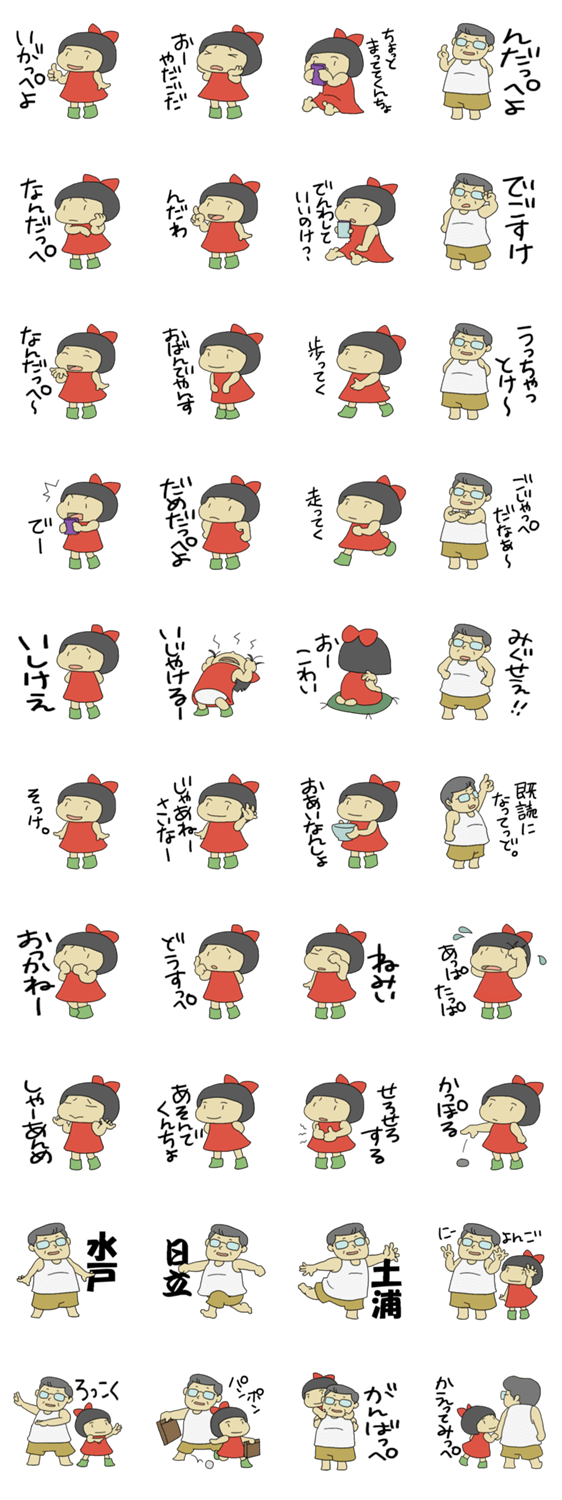 いばらき弁でしゃべっぺよ。 アキ コメントをどうぞ お父ちゃんと、じんこちゃん。2人の話す懐かしい茨城弁をLINEで使ってみっぺよ。 このスタンプどう思う?!↓クリックで投票♪好き (0)かわいい (0)かっこいい (0)おもしろい (0)使いやすそう (0)欲しい (0)萌え (0)ほっこりする (0)おしゃれ (0)ゆるい (0)こわい (0)ウザい (0)キモい (0)ムカつく (0)持ってる (0)癒される (0)セクシー (0)個性的 (0)私は買わない (0)誰かプレゼントして! (0) 購入・プレゼントする Facebookでシェア Twitterでシェア
