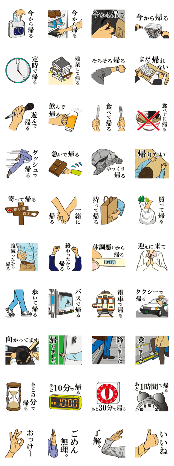 いまから帰るよ。~帰宅連絡専用~ ケバブ コメントをどうぞ 帰る連絡をする時に使うスタンプ。毎日の帰宅連絡に文字を打たなくても「今から帰る」やサラリーマンの「定時で帰る」など男性・女性・学生みんなの帰宅連絡に使えます。 このスタンプどう思う?!↓クリックで投票♪好き (0)かわいい (0)かっこいい (0)おもしろい (0)使いやすそう (0)欲しい (0)萌え (0)ほっこりする (0)おしゃれ (0)ゆるい (0)こわい (0)ウザい (0)キモい (0)ムカつく (0)持ってる (0)癒される (0)セクシー (0)個性的 (0)私は買わない (0)誰かプレゼントして! (0) 購入・プレゼントする Facebookでシェア Twitterでシェア
