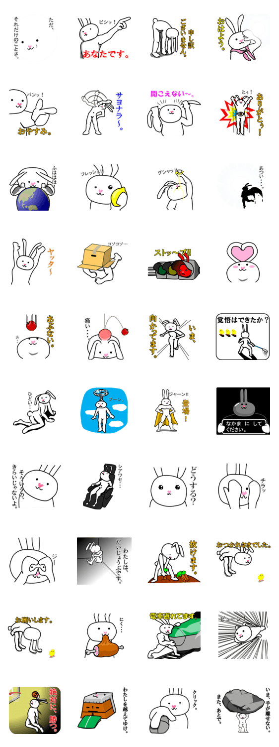 うさぎさん、おせわになっております。 ko8 コメントをどうぞ あのうさぎさんがパワーアップして帰ってきた。ツライこともあるけど、すべての人を笑顔にするために今日もうさぎさんはがんばります。ぜひ使ってあげてください。 このスタンプどう思う?!↓クリックで投票♪好き (0)かわいい (0)かっこいい (0)おもしろい (0)使いやすそう (0)欲しい (0)萌え (0)ほっこりする (0)おしゃれ (0)ゆるい (0)こわい (0)ウザい (0)キモい (0)ムカつく (0)持ってる (0)癒される (0)セクシー (0)個性的 (0)私は買わない (0)誰かプレゼントして! (0) 購入・プレゼントする Facebookでシェア Twitterでシェア