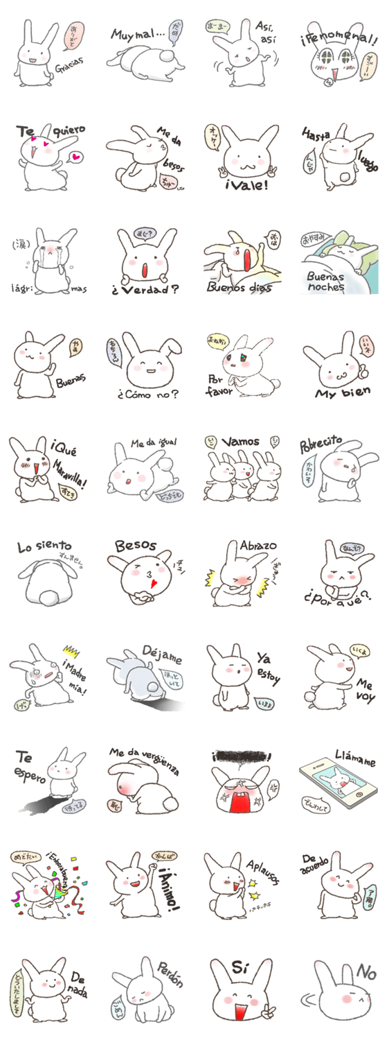 うさぎdeスペイン語 NaomiAkimoto コメントをどうぞ スペイン語を学ぶ人、スペイン語の好きな人のためのスタンプです。対訳日本語もはいっていますので、ただのうさぎの好きな方もぜひ宜しくお願いします。 このスタンプどう思う?!↓クリックで投票♪好き (0)かわいい (0)かっこいい (0)おもしろい (0)使いやすそう (0)欲しい (0)萌え (0)ほっこりする (0)おしゃれ (0)ゆるい (0)こわい (0)ウザい (0)キモい (0)ムカつく (0)持ってる (0)癒される (0)セクシー (0)個性的 (0)私は買わない (0)誰かプレゼントして! (0) 購入・プレゼントする Facebookでシェア Twitterでシェア