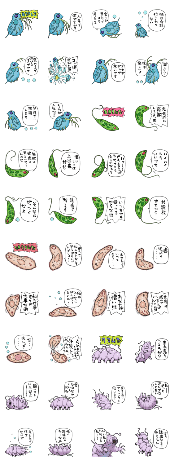 おしゃべり微生物 蛇作堂 コメントをどうぞ 言いにくいことも微生物の口を借りれば言えるかも。ミジンコ、ミドリムシ、ゾウリムシ、クマムシのセットです。「それなに?」って尋ねられたときの返答用スタンプ付き。 このスタンプどう思う?!↓クリックで投票♪好き (0)かわいい (0)かっこいい (0)おもしろい (0)使いやすそう (0)欲しい (0)萌え (0)ほっこりする (0)おしゃれ (0)ゆるい (0)こわい (0)ウザい (0)キモい (0)ムカつく (0)持ってる (0)癒される (0)セクシー (0)個性的 (0)私は買わない (0)誰かプレゼントして! (0) 購入・プレゼントする Facebookでシェア Twitterでシェア