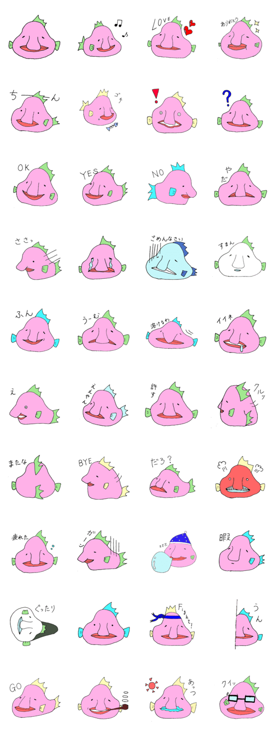 おじさかな hirako コメントをどうぞ おっさんの顔で有名な深海魚の「ニュウドウカジカ」をモデルにしたゆるキャラです。気分によって体の色が変化します。きもかわでゆるい表情に是非癒されてください。 このスタンプどう思う?!↓クリックで投票♪好き (0)かわいい (0)かっこいい (0)おもしろい (0)使いやすそう (0)欲しい (0)萌え (0)ほっこりする (0)おしゃれ (0)ゆるい (0)こわい (0)ウザい (0)キモい (0)ムカつく (0)持ってる (0)癒される (0)セクシー (0)個性的 (0)私は買わない (0)誰かプレゼントして! (0) 購入・プレゼントする Facebookでシェア Twitterでシェア