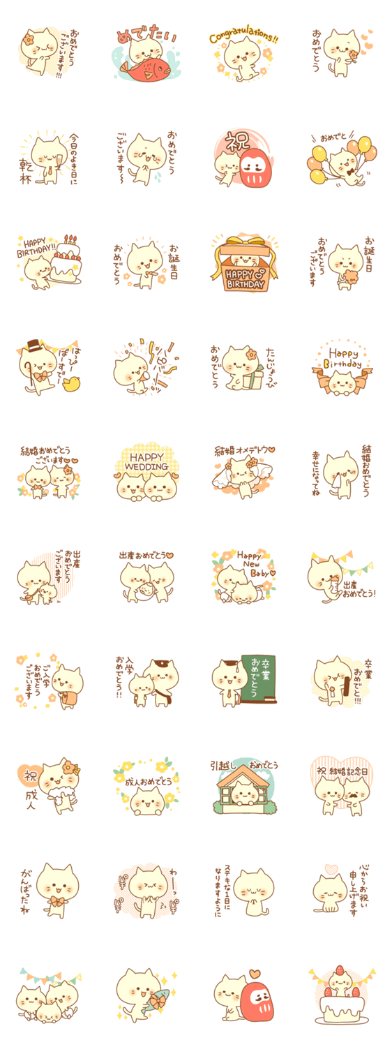 おめでとにゃんこスタンプ DECOR コメントをどうぞ お誕生日や、結婚、出産、入学、卒業、成人などのお祝いの言葉と共に祝ってくれる可愛いにゃんこスタンプです♪ このスタンプどう思う?!↓クリックで投票♪好き (0)かわいい (0)かっこいい (0)おもしろい (0)使いやすそう (0)欲しい (0)萌え (0)ほっこりする (0)おしゃれ (0)ゆるい (0)こわい (0)ウザい (0)キモい (0)ムカつく (0)持ってる (0)癒される (0)セクシー (0)個性的 (0)私は買わない (0)誰かプレゼントして! (0) 購入・プレゼントする Facebookでシェア Twitterでシェア
