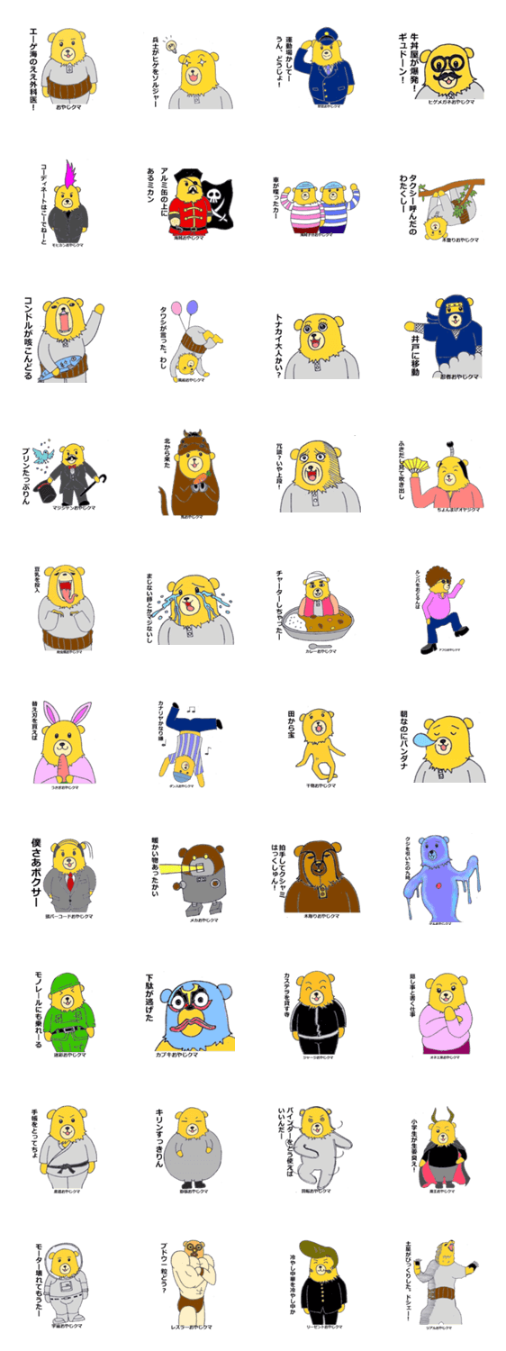 おやじクマ達のダジャレ40連発 絶なにがし コメントをどうぞ おやじクマ達のシュールなダジャレスタンプ。返事に困った時や何を言って良いか分からないときはこれで乗り切れ!これで君も好印象間違いなし! このスタンプどう思う?!↓クリックで投票♪好き (0)かわいい (0)かっこいい (0)おもしろい (0)使いやすそう (0)欲しい (0)萌え (0)ほっこりする (0)おしゃれ (0)ゆるい (0)こわい (0)ウザい (0)キモい (0)ムカつく (0)持ってる (0)癒される (0)セクシー (0)個性的 (0)私は買わない (0)誰かプレゼントして! (0) 購入・プレゼントする Facebookでシェア Twitterでシェア