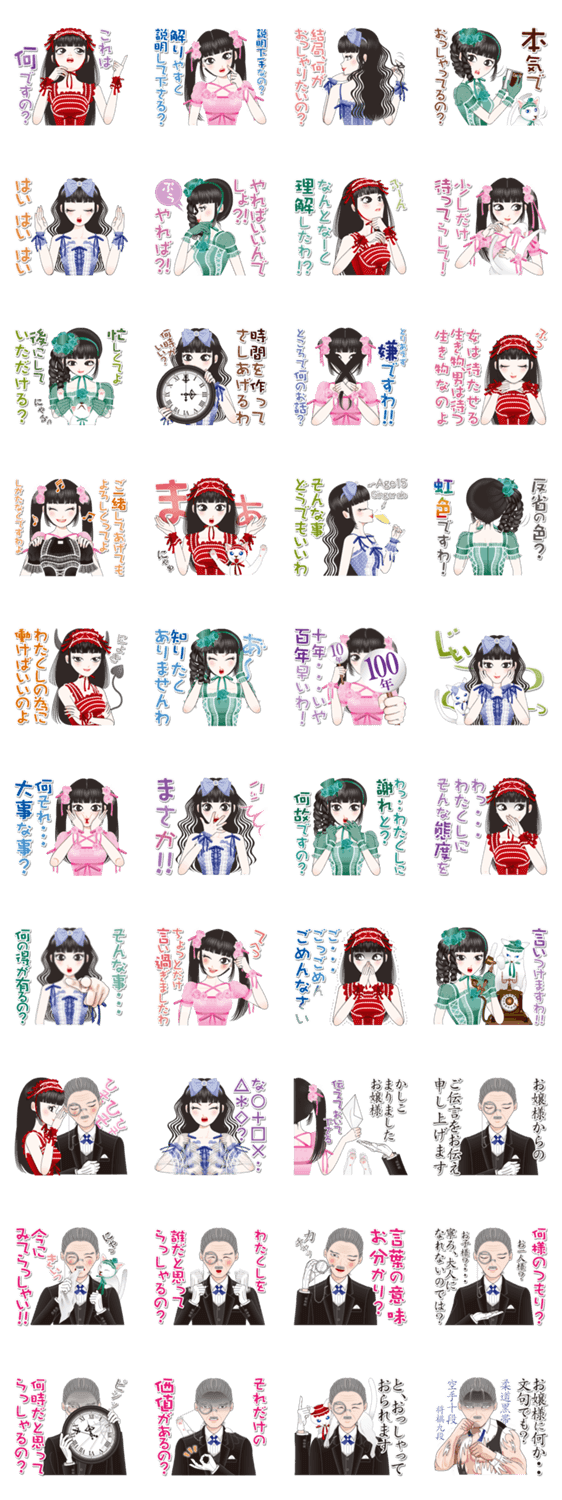 お嬢様と執事 PRIME MEMORY Ami コメントをどうぞ ダントツの上から目線で、高飛車過ぎるゴスロリお嬢様「美麗」登場!毒舌&執事にも伝言させてしまうのに、彼女が言うと何故か許せてしまいます。美ネコも出て来ますよ☆ このスタンプどう思う?!↓クリックで投票♪好き (0)かわいい (0)かっこいい (0)おもしろい (0)使いやすそう (0)欲しい (0)萌え (0)ほっこりする (0)おしゃれ (0)ゆるい (0)こわい (0)ウザい (0)キモい (0)ムカつく (0)持ってる (0)癒される (0)セクシー (0)個性的 (0)私は買わない (0)誰かプレゼントして! (0) 購入・プレゼントする Facebookでシェア Twitterでシェア