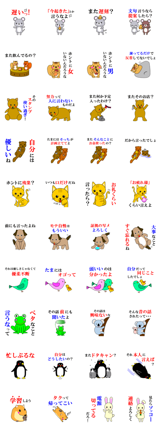 お怒りフレーズ with カワイイ動物たち Leaf コメントをどうぞ お怒りフレーズもカワイイ動物たちと一緒なら角が立たない(?) 男女問わず使えるスタンプです。怒っていることをカワイク伝えよう。 このスタンプどう思う?!↓クリックで投票♪好き (0)かわいい (0)かっこいい (0)おもしろい (0)使いやすそう (0)欲しい (0)萌え (0)ほっこりする (0)おしゃれ (0)ゆるい (0)こわい (0)ウザい (0)キモい (0)ムカつく (0)持ってる (0)癒される (0)セクシー (0)個性的 (0)私は買わない (0)誰かプレゼントして! (0) 購入・プレゼントする Facebookでシェア Twitterでシェア