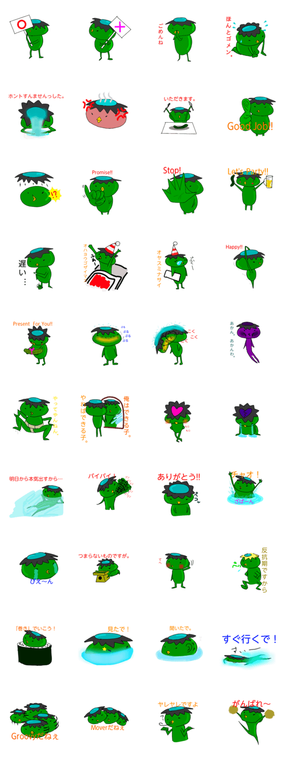 かっぱっぽいのが川流れ ぽこぴっく コメントをどうぞ てかてかのかっぱのような生き物。彼は甲羅も責任も背負いませんから、ゆるい一日を今日も過ごします。 このスタンプどう思う?!↓クリックで投票♪好き (0)かわいい (0)かっこいい (0)おもしろい (0)使いやすそう (0)欲しい (0)萌え (0)ほっこりする (0)おしゃれ (0)ゆるい (0)こわい (0)ウザい (0)キモい (0)ムカつく (0)持ってる (0)癒される (0)セクシー (0)個性的 (0)私は買わない (0)誰かプレゼントして! (0) 購入・プレゼントする Facebookでシェア Twitterでシェア