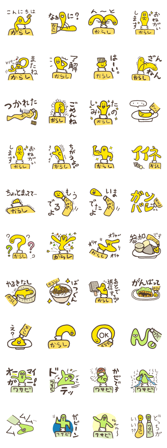 からしとワサビ 7mt コメントをどうぞ いつも脇役のからしとワサビが、スタンプでとうとう主役に!!普段はスパイシーなからしとワサビが、ゆるく活躍してくれます! このスタンプどう思う?!↓クリックで投票♪好き (0)かわいい (0)かっこいい (0)おもしろい (0)使いやすそう (0)欲しい (0)萌え (0)ほっこりする (0)おしゃれ (0)ゆるい (0)こわい (0)ウザい (0)キモい (0)ムカつく (0)持ってる (0)癒される (0)セクシー (0)個性的 (0)私は買わない (0)誰かプレゼントして! (0) 購入・プレゼントする Facebookでシェア Twitterでシェア