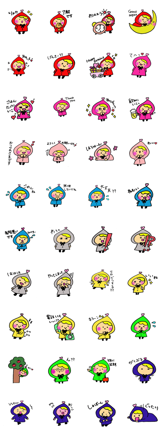 からふるずきんちゃん あかちん コメントをどうぞ 感情によってずきんの色が変化しちゃう、からふるずきんちゃんです。ほわほわした表情やちょっとゆるい表情など、いろんな表情のからふるずきんちゃんがいます** このスタンプどう思う?!↓クリックで投票♪好き (0)かわいい (0)かっこいい (0)おもしろい (0)使いやすそう (0)欲しい (0)萌え (0)ほっこりする (0)おしゃれ (0)ゆるい (0)こわい (0)ウザい (0)キモい (0)ムカつく (0)持ってる (0)癒される (0)セクシー (0)個性的 (0)私は買わない (0)誰かプレゼントして! (0) 購入・プレゼントする Facebookでシェア Twitterでシェア
