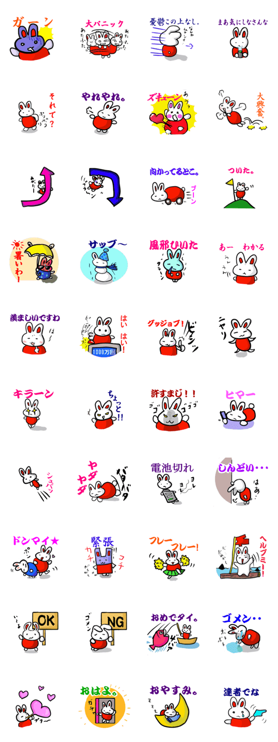かわいいダケじゃないうさぎ なつみ うさこ コメントをどうぞ かわいい、時々オバちゃん。さまざまな顔をあわせもつ謎のうさちゃん。変と言われても自分の道を攻撃的に突っ走る。わたし、もう突き抜けちゃっても構わない。 このスタンプどう思う?!↓クリックで投票♪好き (0)かわいい (0)かっこいい (0)おもしろい (0)使いやすそう (0)欲しい (0)萌え (0)ほっこりする (0)おしゃれ (0)ゆるい (0)こわい (0)ウザい (0)キモい (0)ムカつく (0)持ってる (0)癒される (0)セクシー (0)個性的 (0)私は買わない (0)誰かプレゼントして! (0) 購入・プレゼントする Facebookでシェア Twitterでシェア