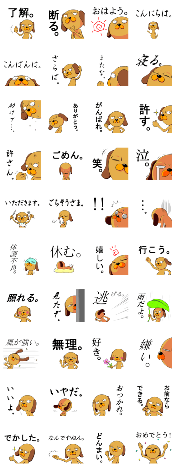 ぎょろ犬(日常会話編) ぱせ コメントをどうぞ 目つきが悪く、ふてぶてしい態度のぎょろ犬。しかし、照れ屋で優しい一面もあり、どこか憎めないぎょろ犬が日常会話で使えるスタンプに登場。 このスタンプどう思う?!↓クリックで投票♪好き (0)かわいい (0)かっこいい (0)おもしろい (0)使いやすそう (0)欲しい (0)萌え (0)ほっこりする (0)おしゃれ (0)ゆるい (0)こわい (0)ウザい (0)キモい (0)ムカつく (0)持ってる (0)癒される (0)セクシー (0)個性的 (0)私は買わない (0)誰かプレゼントして! (0) 購入・プレゼントする Facebookでシェア Twitterでシェア