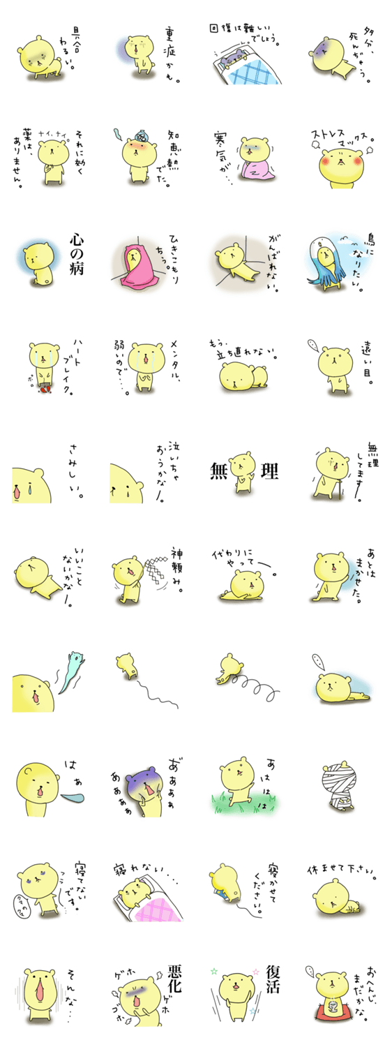 くま太のなんだかちょっと病んでます。 Shiorin コメントをどうぞ 病気な時、具合、体調の悪い時、心が折れてる時、ネガティブな時、クマのくま太が心の声をお届けします。 このスタンプどう思う?!↓クリックで投票♪好き (0)かわいい (0)かっこいい (0)おもしろい (0)使いやすそう (0)欲しい (0)萌え (0)ほっこりする (0)おしゃれ (0)ゆるい (0)こわい (0)ウザい (0)キモい (0)ムカつく (0)持ってる (0)癒される (0)セクシー (0)個性的 (0)私は買わない (0)誰かプレゼントして! (0) 購入・プレゼントする Facebookでシェア Twitterでシェア