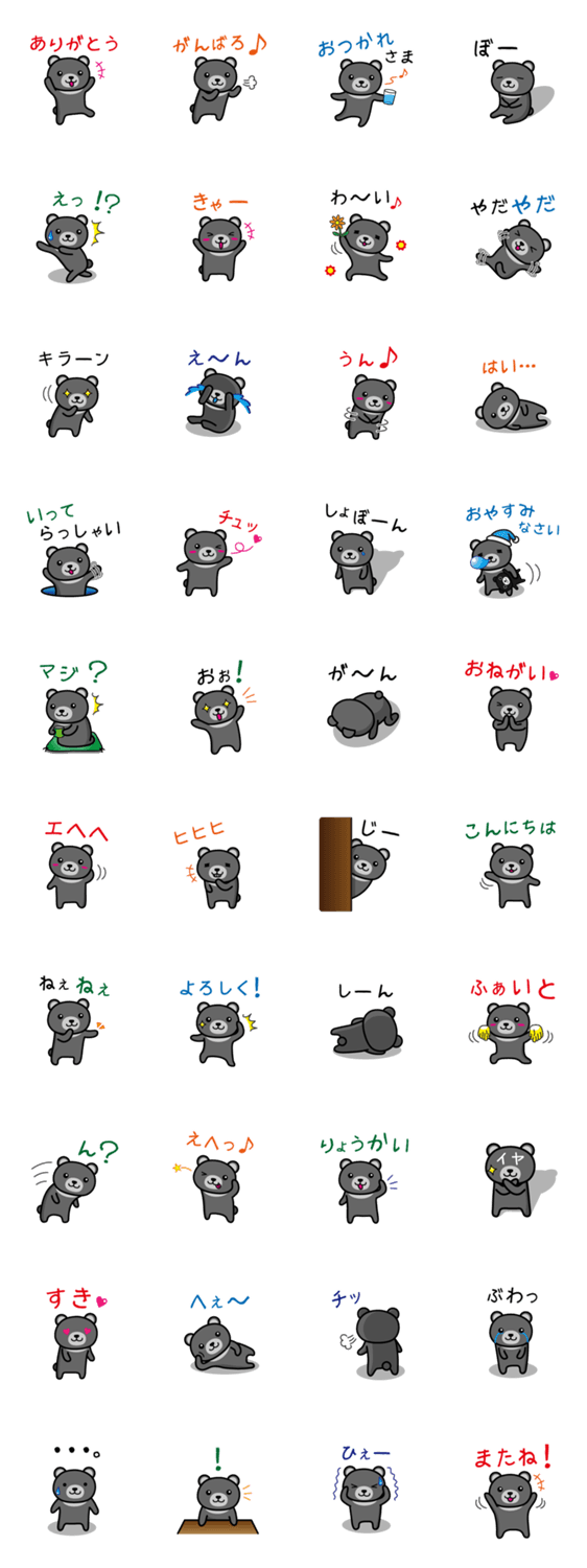 くろ★くま hikida コメントをどうぞ ツキノワグマの子供のクマさんです。今日も泣いたり笑ったり、楽しく暮らしています。あなたのトークにまぜてあげてください。 このスタンプどう思う?!↓クリックで投票♪好き (0)かわいい (0)かっこいい (0)おもしろい (0)使いやすそう (0)欲しい (0)萌え (0)ほっこりする (0)おしゃれ (0)ゆるい (0)こわい (0)ウザい (0)キモい (0)ムカつく (0)持ってる (0)癒される (0)セクシー (0)個性的 (0)私は買わない (0)誰かプレゼントして! (0) 購入・プレゼントする Facebookでシェア Twitterでシェア