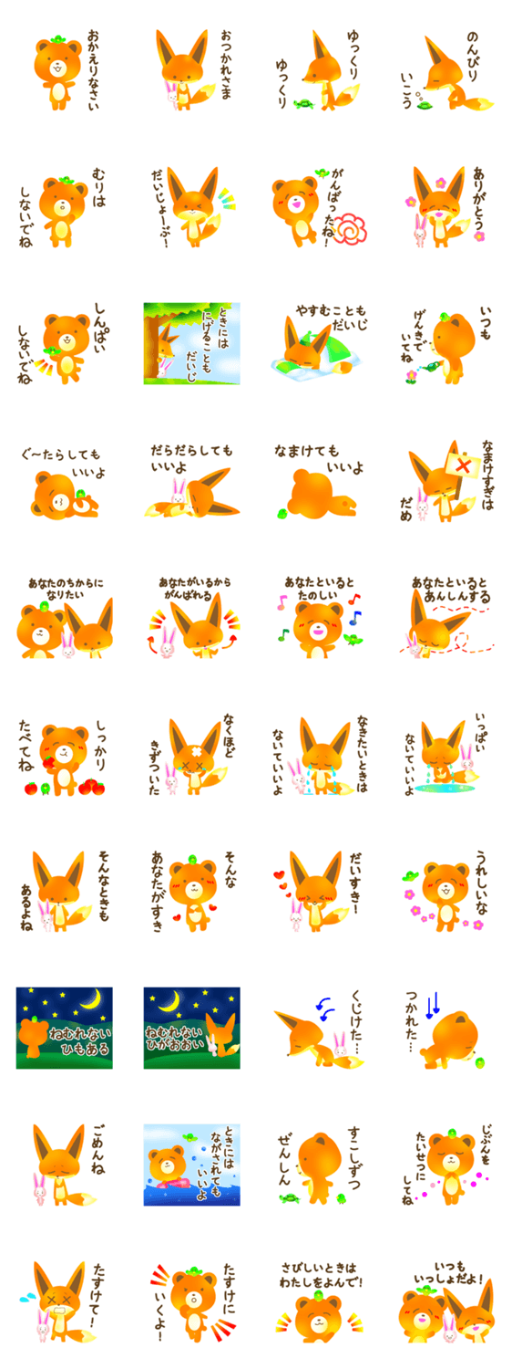 こぎつねとこぐまのスタンプ FUWAFUWA コメントをどうぞ こぎつねとこぐまのスタンプです。うさぎやかめも出てきます。こぐまのそばにいる緑の生き物はことりです。普段、言いにくい言葉を集めてみました。使えるかどうかは…。 このスタンプどう思う?!↓クリックで投票♪好き (0)かわいい (0)かっこいい (0)おもしろい (0)使いやすそう (0)欲しい (0)萌え (0)ほっこりする (0)おしゃれ (0)ゆるい (0)こわい (0)ウザい (0)キモい (0)ムカつく (0)持ってる (0)癒される (0)セクシー (0)個性的 (0)私は買わない (0)誰かプレゼントして! (0) 購入・プレゼントする Facebookでシェア Twitterでシェア