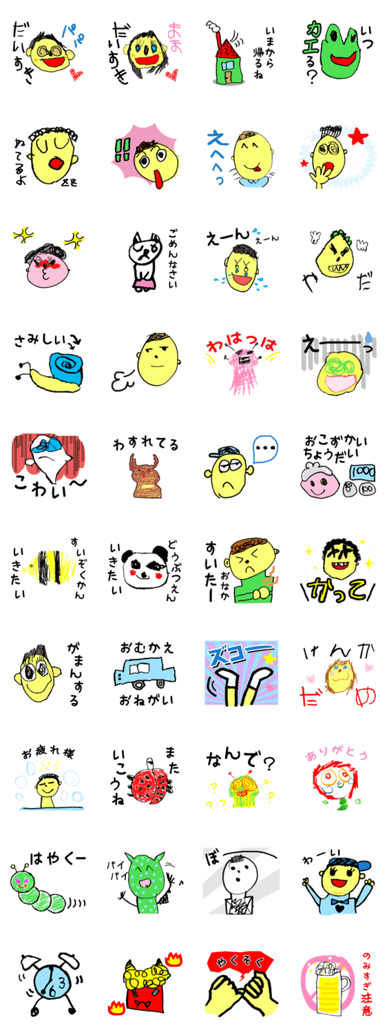 こども手描きスタンプ achii コメントをどうぞ 子どもがすべて手描きで表現した愛のこもったイラストスタンプです。パパママへ送る用。思わずグッっとくることも。 このスタンプどう思う?!↓クリックで投票♪好き (0)かわいい (0)かっこいい (0)おもしろい (0)使いやすそう (0)欲しい (0)萌え (0)ほっこりする (0)おしゃれ (0)ゆるい (0)こわい (0)ウザい (0)キモい (0)ムカつく (0)持ってる (0)癒される (0)セクシー (0)個性的 (0)私は買わない (0)誰かプレゼントして! (0) 購入・プレゼントする Facebookでシェア Twitterでシェア