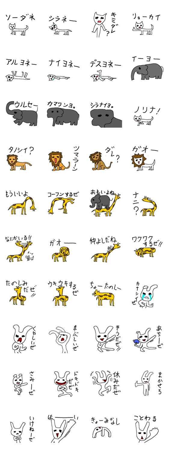 こんなやつら見てみたい。へたくそ動物園2 TK コメントをどうぞ 愉快な動物たち、きりん、ねこ、うさぎに新しい仲間、ぞう、ライオンが加わった。 このスタンプどう思う?!↓クリックで投票♪好き (0)かわいい (0)かっこいい (0)おもしろい (0)使いやすそう (0)欲しい (0)萌え (0)ほっこりする (0)おしゃれ (0)ゆるい (0)こわい (0)ウザい (0)キモい (0)ムカつく (0)持ってる (0)癒される (0)セクシー (0)個性的 (0)私は買わない (0)誰かプレゼントして! (0) 購入・プレゼントする Facebookでシェア Twitterでシェア
