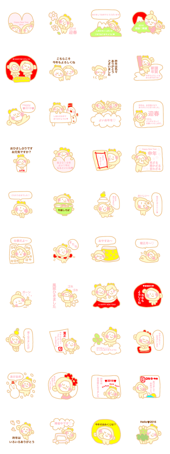 さる子ちゃんのお正月年賀状スタンプ イラストレーターrara コメントをどうぞ あけましておめでとう、Happy new year、今年もよろしくなど新年のご挨拶に使える2016年スタンプ。ほのぼのさる子ちゃんと楽しいお正月。たくさん使ってくださいね。 このスタンプどう思う?!↓クリックで投票♪好き (0)かわいい (0)かっこいい (0)おもしろい (0)使いやすそう (0)欲しい (0)萌え (0)ほっこりする (0)おしゃれ (0)ゆるい (0)こわい (0)ウザい (0)キモい (0)ムカつく (0)持ってる (0)癒される (0)セクシー (0)個性的 (0)私は買わない (0)誰かプレゼントして! (0) 購入・プレゼントする Facebookでシェア Twitterでシェア