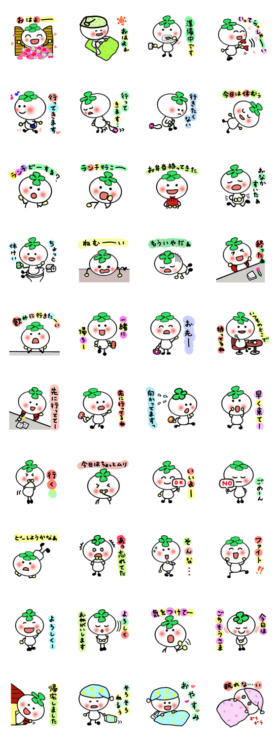 しあわせクローバー2 でこっぺ コメントをどうぞ しあわせクローバー第2弾!朝起きてから会社に行って寝るまでをイメージした日常編です。OLの方はもちろん、学生の方、サラリーマンの方もかわいく使ってください。 このスタンプどう思う?!↓クリックで投票♪好き (0)かわいい (0)かっこいい (0)おもしろい (0)使いやすそう (0)欲しい (0)萌え (0)ほっこりする (0)おしゃれ (0)ゆるい (0)こわい (0)ウザい (0)キモい (0)ムカつく (0)持ってる (0)癒される (0)セクシー (0)個性的 (0)私は買わない (0)誰かプレゼントして! (0) 購入・プレゼントする Facebookでシェア Twitterでシェア