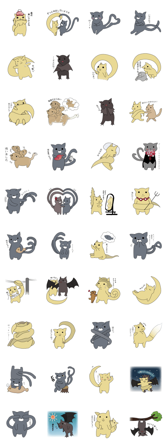 しっぽネコたち 2241neco コメントをどうぞ 尻尾の長いしっぽネコと、尻尾が2本あるネコ又のスタンプです。コウモリやケルベロスのスタンプも少し入れました。 このスタンプどう思う?!↓クリックで投票♪好き (0)かわいい (0)かっこいい (0)おもしろい (0)使いやすそう (0)欲しい (0)萌え (0)ほっこりする (0)おしゃれ (0)ゆるい (0)こわい (0)ウザい (0)キモい (0)ムカつく (0)持ってる (0)癒される (0)セクシー (0)個性的 (0)私は買わない (0)誰かプレゼントして! (0) 購入・プレゼントする Facebookでシェア Twitterでシェア