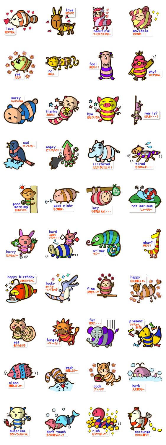 しましま あさまろ コメントをどうぞ 40種類の可愛いしましまの動物達が色んなシーンで英語と関西弁で呟きます。愛嬌のあるやつ、やる気のないやつ、目つきの悪いやつなど、ブサかわの動物達をどうぞよろしく。 このスタンプどう思う?!↓クリックで投票♪好き (0)かわいい (0)かっこいい (0)おもしろい (0)使いやすそう (0)欲しい (0)萌え (0)ほっこりする (0)おしゃれ (0)ゆるい (0)こわい (0)ウザい (0)キモい (0)ムカつく (0)持ってる (0)癒される (0)セクシー (0)個性的 (0)私は買わない (0)誰かプレゼントして! (0) 購入・プレゼントする Facebookでシェア Twitterでシェア