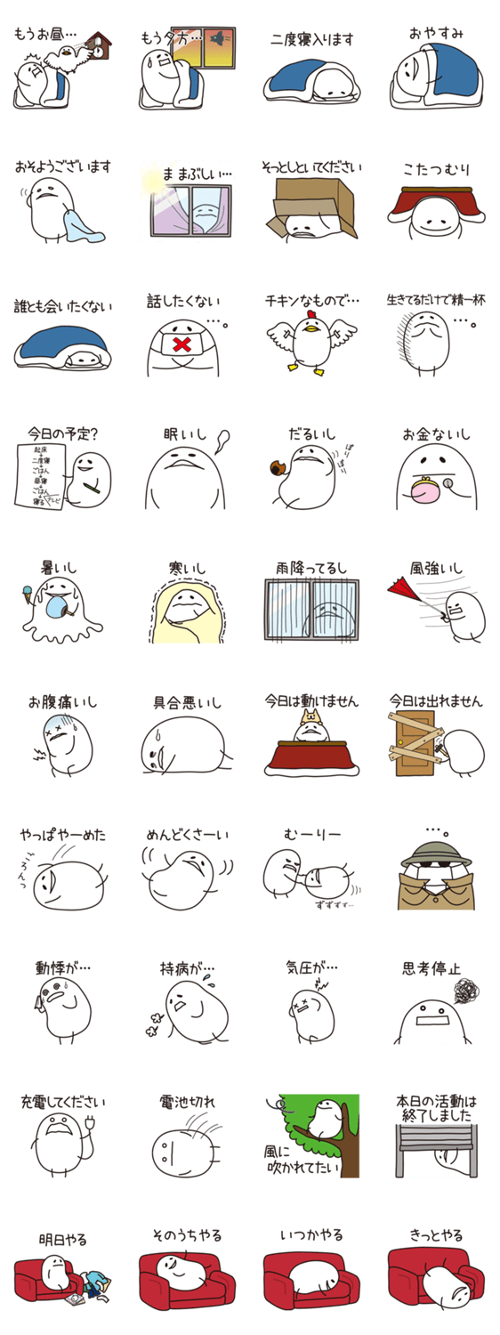 しろたさん(ひきこもり編) しろまる コメントをどうぞ ちょっぴり根暗でひきこもりがちのしろたさんのスタンプです。 誰とも話したくない… そんな日はスタンプぽんっでサラッとすませちゃいましょう。 このスタンプどう思う?!↓クリックで投票♪好き (0)かわいい (0)かっこいい (0)おもしろい (0)使いやすそう (0)欲しい (0)萌え (0)ほっこりする (0)おしゃれ (0)ゆるい (0)こわい (0)ウザい (0)キモい (0)ムカつく (0)持ってる (0)癒される (0)セクシー (0)個性的 (0)私は買わない (0)誰かプレゼントして! (0) 購入・プレゼントする Facebookでシェア Twitterでシェア