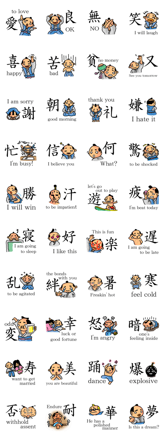 しろめのとの Takashi hasegawa コメントをどうぞ 白目のお殿様が日本の漢字、一字を使って表現する愉快でかわいい殿様のスタンプです。特に外国の方に使うと面白いと思います。 このスタンプどう思う?!↓クリックで投票♪好き (0)かわいい (0)かっこいい (0)おもしろい (0)使いやすそう (0)欲しい (0)萌え (0)ほっこりする (0)おしゃれ (0)ゆるい (0)こわい (0)ウザい (0)キモい (0)ムカつく (0)持ってる (0)癒される (0)セクシー (0)個性的 (0)私は買わない (0)誰かプレゼントして! (0) 購入・プレゼントする Facebookでシェア Twitterでシェア