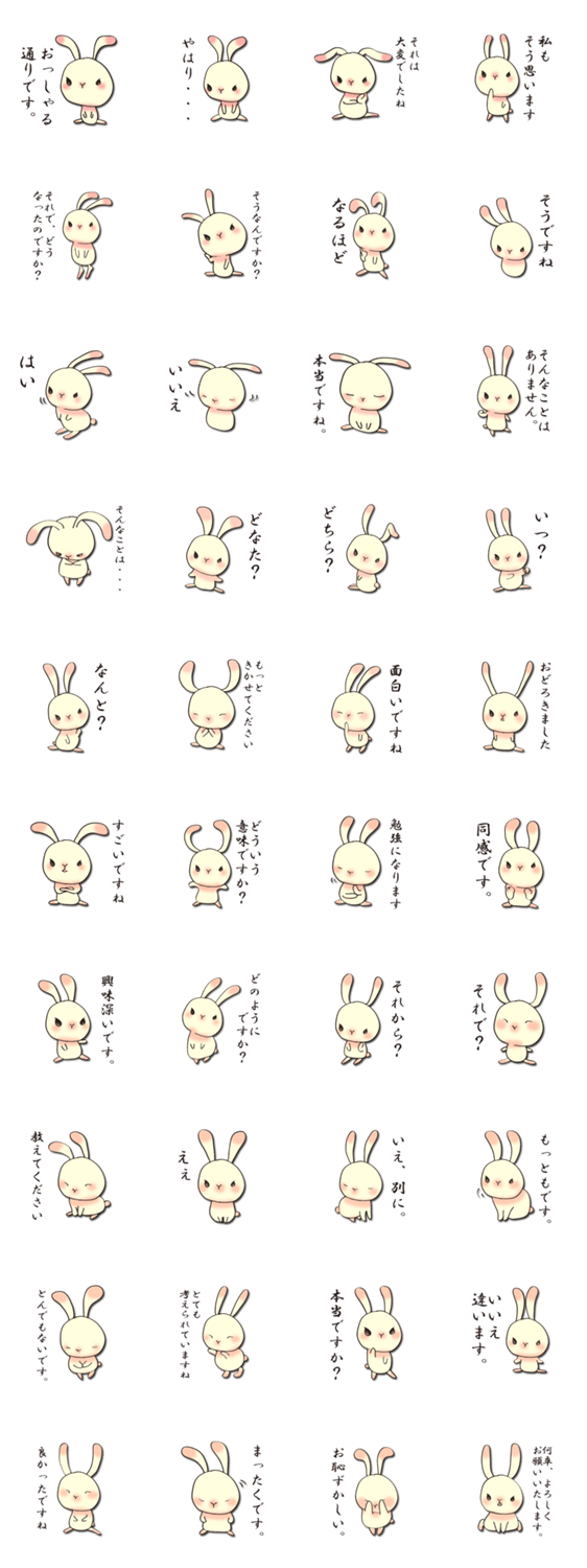 そっけない顔して相づち上手なウサギさん 恵理恵理 コメントをどうぞ 良く使うあいづちを、うさぎさんのそっけない顔に合わせ丁寧な言葉でお送りいたします☆ このスタンプどう思う?!↓クリックで投票♪好き (0)かわいい (0)かっこいい (0)おもしろい (0)使いやすそう (0)欲しい (0)萌え (0)ほっこりする (0)おしゃれ (0)ゆるい (0)こわい (0)ウザい (0)キモい (0)ムカつく (0)持ってる (0)癒される (0)セクシー (0)個性的 (0)私は買わない (0)誰かプレゼントして! (0) 購入・プレゼントする Facebookでシェア Twitterでシェア