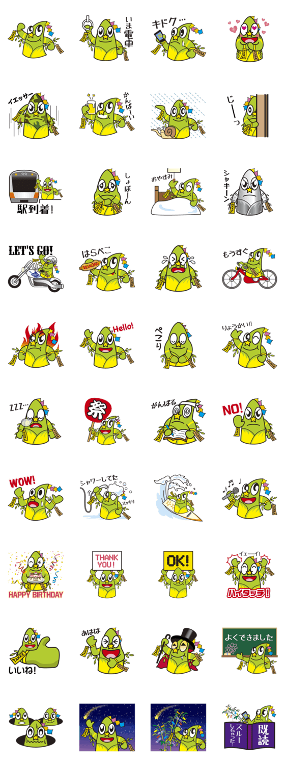 たっけー☆☆(福生市公式キャラクター) エイゾーワンダーランド コメントをどうぞ 福生七夕まつりから誕生した竹(飾り)の妖精「たっけー」。あらゆるところへ出没しては、願いが叶うと巷で話題(?)の「たっけーハイタッチ」で、みんなに幸せを運びます!! このスタンプどう思う?!↓クリックで投票♪好き (0)かわいい (4)かっこいい (0)おもしろい (0)使いやすそう (0)欲しい (1)萌え (0)ほっこりする (1)おしゃれ (0)ゆるい (0)こわい (0)ウザい (0)キモい (0)ムカつく (0)持ってる (0)癒される (0)セクシー (0)個性的 (0)私は買わない (0)誰かプレゼントして! (0) 購入・プレゼントする Facebookでシェア Twitterでシェア