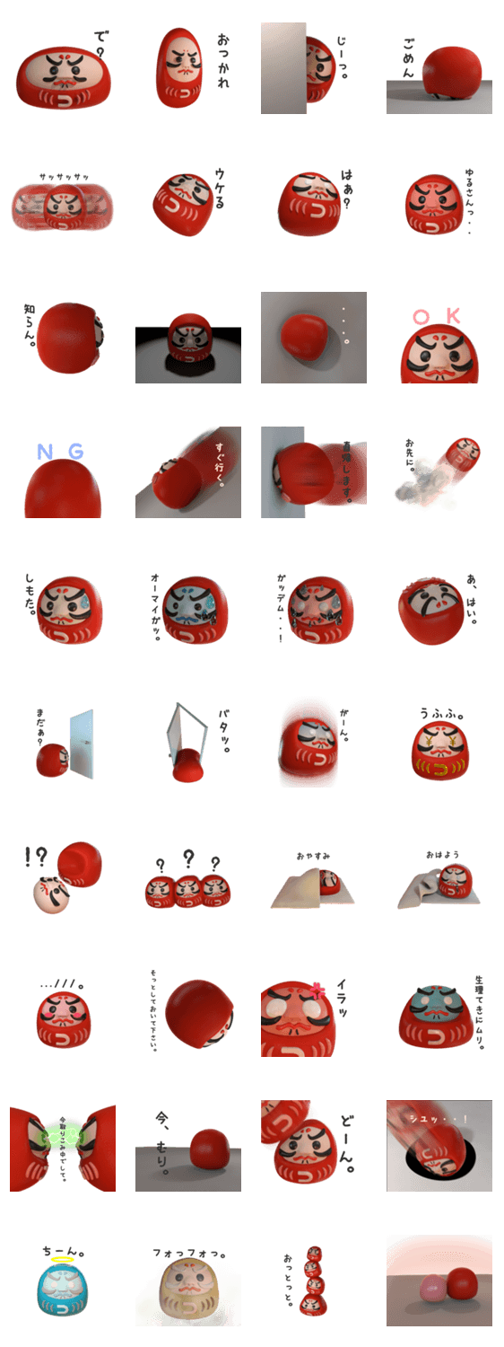だるまジャパンです。 だるまジャパン合同会社 コメントをどうぞ 友達、恋人、家族、上司に使える可愛いだるまのスタンプです。 このスタンプどう思う?!↓クリックで投票♪好き (0)かわいい (0)かっこいい (0)おもしろい (0)使いやすそう (0)欲しい (0)萌え (0)ほっこりする (0)おしゃれ (0)ゆるい (0)こわい (0)ウザい (0)キモい (0)ムカつく (0)持ってる (0)癒される (0)セクシー (0)個性的 (0)私は買わない (0)誰かプレゼントして! (0) 購入・プレゼントする Facebookでシェア Twitterでシェア