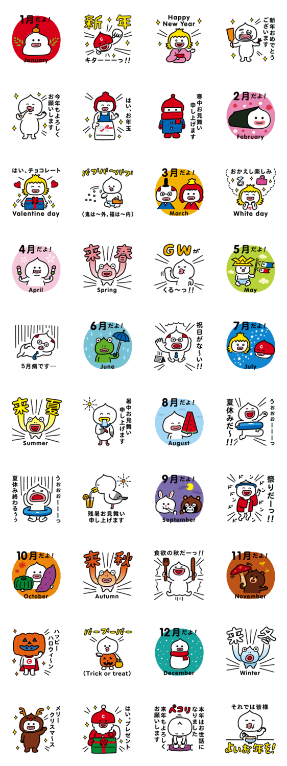 ちぇけらっちょ25 暦らっちょ タラジロウ コメントをどうぞ ちぇけスタ第25弾。春夏秋冬、1月から12月までのお知らせと挨拶のスタンプです。 このスタンプどう思う?!↓クリックで投票♪好き (0)かわいい (0)かっこいい (0)おもしろい (0)使いやすそう (0)欲しい (0)萌え (0)ほっこりする (0)おしゃれ (0)ゆるい (0)こわい (0)ウザい (0)キモい (0)ムカつく (0)持ってる (0)癒される (0)セクシー (0)個性的 (0)私は買わない (0)誰かプレゼントして! (0) 購入・プレゼントする Facebookでシェア Twitterでシェア