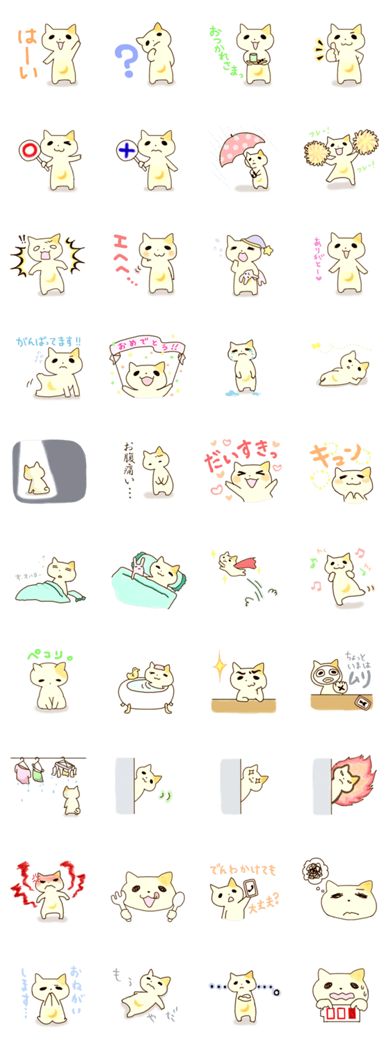 つきのわねこ dia コメントをどうぞ 「つきのわねこ」は、たれ目でちょっぴりマイペースな猫です。チャームポイントはおなかの月マーク。 このスタンプどう思う?!↓クリックで投票♪好き (0)かわいい (0)かっこいい (0)おもしろい (0)使いやすそう (0)欲しい (0)萌え (0)ほっこりする (0)おしゃれ (0)ゆるい (0)こわい (0)ウザい (0)キモい (0)ムカつく (0)持ってる (0)癒される (0)セクシー (0)個性的 (0)私は買わない (0)誰かプレゼントして! (0) 購入・プレゼントする Facebookでシェア Twitterでシェア