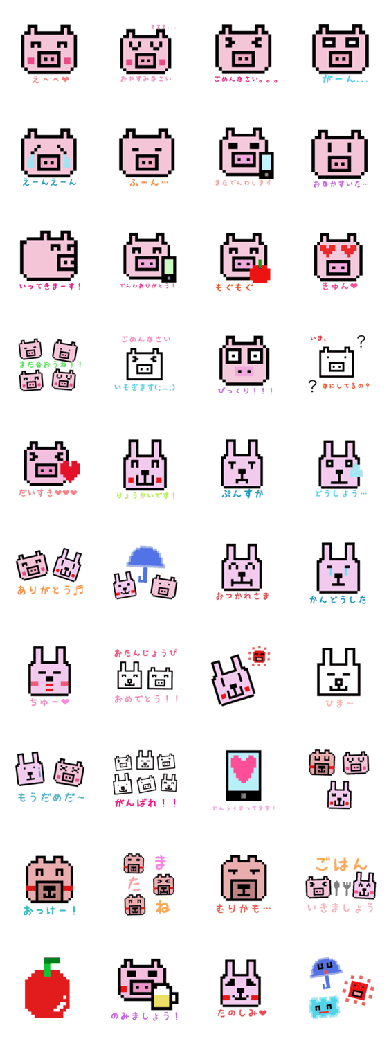 どっとさん達 ぶなちゃん コメントをどうぞ ドット絵で描いたぶたさんうさぎさんときどきくまさんのスタンプです☆ このスタンプどう思う?!↓クリックで投票♪好き (0)かわいい (0)かっこいい (0)おもしろい (0)使いやすそう (0)欲しい (0)萌え (0)ほっこりする (0)おしゃれ (0)ゆるい (0)こわい (0)ウザい (0)キモい (0)ムカつく (0)持ってる (0)癒される (0)セクシー (0)個性的 (0)私は買わない (0)誰かプレゼントして! (0) 購入・プレゼントする Facebookでシェア Twitterでシェア