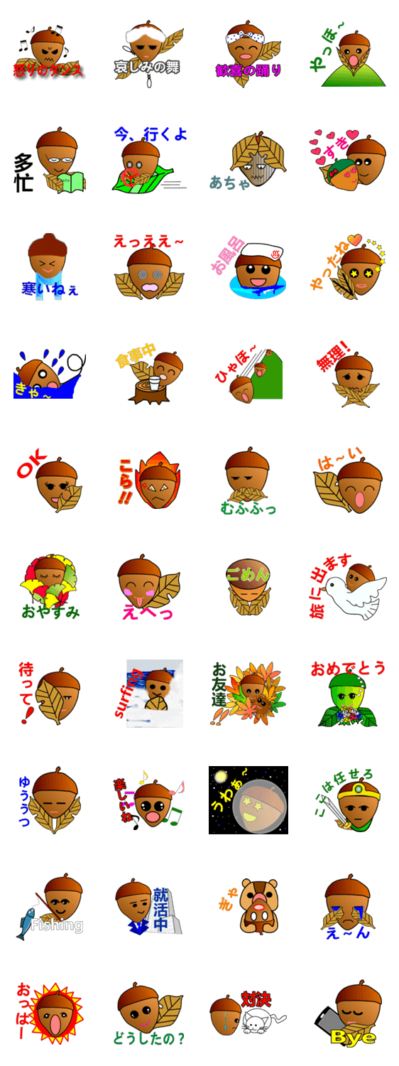 どんぐり坊やの大冒険 yum.t コメントをどうぞ どんぐり坊やは空想する。 海ってどんな所なんだろう? 空を飛べたら気持ちがいいだろうな・・・あの山のてっぺんからコロコロ転がり落ちたら楽しいだろうな。 このスタンプどう思う?!↓クリックで投票♪好き (0)かわいい (0)かっこいい (0)おもしろい (0)使いやすそう (0)欲しい (0)萌え (0)ほっこりする (0)おしゃれ (0)ゆるい (0)こわい (0)ウザい (0)キモい (0)ムカつく (0)持ってる (0)癒される (0)セクシー (0)個性的 (0)私は買わない (0)誰かプレゼントして! (0) 購入・プレゼントする Facebookでシェア Twitterでシェア