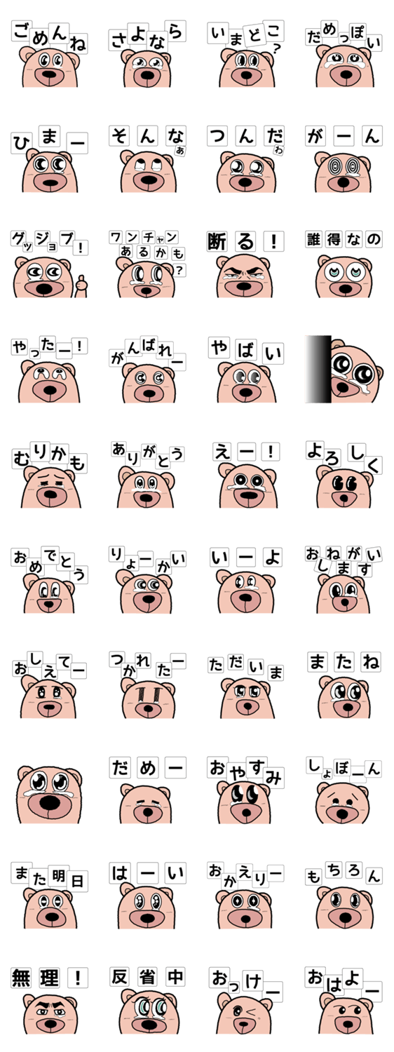なみだ目クマ (だ目クマ) MnPro コメントをどうぞ なぜかいつも涙目のクマ。 ゴメンナサイ系、目ヂカラ系スタンプです。 このスタンプどう思う?!↓クリックで投票♪好き (0)かわいい (0)かっこいい (0)おもしろい (0)使いやすそう (0)欲しい (0)萌え (0)ほっこりする (0)おしゃれ (0)ゆるい (0)こわい (0)ウザい (0)キモい (0)ムカつく (0)持ってる (0)癒される (0)セクシー (0)個性的 (0)私は買わない (0)誰かプレゼントして! (0) 購入・プレゼントする Facebookでシェア Twitterでシェア
