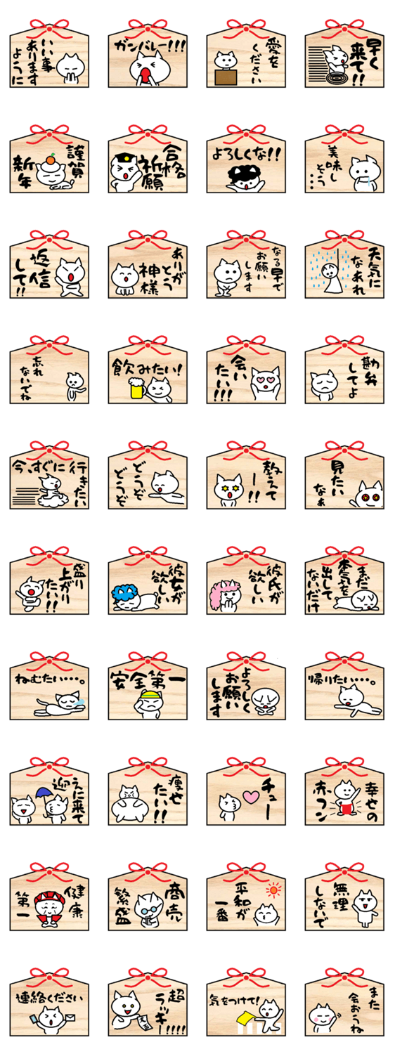 にゃんこ絵馬 miblue コメントをどうぞ 「にゃんこ絵馬」は、馬は描かれていませんが、ちょっとしたお願い事を伝えるスタンプ絵馬です!よろしくお願いします! このスタンプどう思う?!↓クリックで投票♪好き (0)かわいい (0)かっこいい (0)おもしろい (0)使いやすそう (0)欲しい (0)萌え (0)ほっこりする (0)おしゃれ (0)ゆるい (0)こわい (0)ウザい (0)キモい (0)ムカつく (0)持ってる (0)癒される (0)セクシー (0)個性的 (0)私は買わない (0)誰かプレゼントして! (0) 購入・プレゼントする Facebookでシェア Twitterでシェア