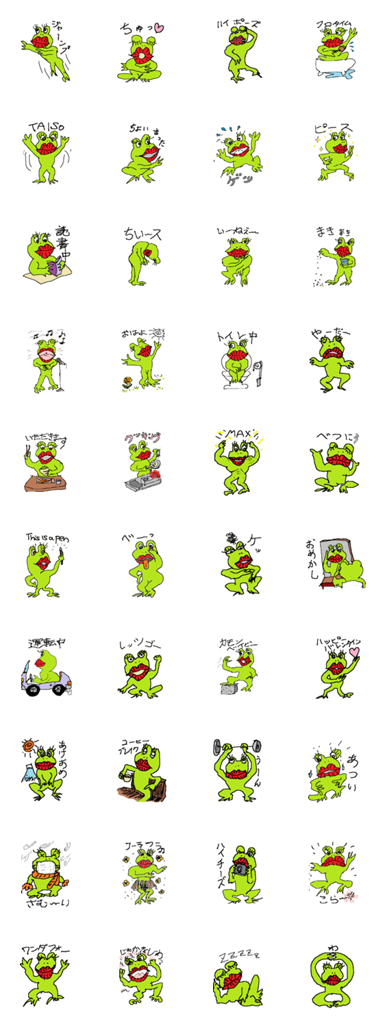 びるくちガエル Piroz コメントをどうぞ 大きくて真っ赤な唇がチャームポイントのカエルです。ちょっとキモくて可愛い”びるくちガエル”が、あなたの気持ちをお届けします。 このスタンプどう思う?!↓クリックで投票♪好き (0)かわいい (0)かっこいい (0)おもしろい (0)使いやすそう (0)欲しい (0)萌え (0)ほっこりする (0)おしゃれ (0)ゆるい (0)こわい (0)ウザい (0)キモい (0)ムカつく (0)持ってる (0)癒される (0)セクシー (0)個性的 (0)私は買わない (0)誰かプレゼントして! (0) 購入・プレゼントする Facebookでシェア Twitterでシェア
