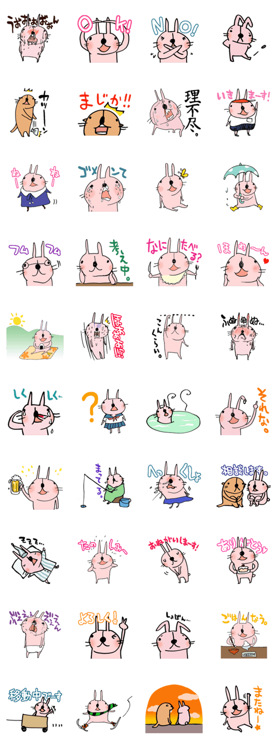 ふにゃうさ shimaidou コメントをどうぞ ふにゃふにゃしたウサギ(たまにラッコも)です。ゆるい脱力した笑顔からブサイクな泣き顔まで。日々の喜びと、当たり前にある切なさを表現するスタンプです。 このスタンプどう思う?!↓クリックで投票♪好き (0)かわいい (0)かっこいい (0)おもしろい (0)使いやすそう (0)欲しい (0)萌え (0)ほっこりする (0)おしゃれ (0)ゆるい (0)こわい (0)ウザい (0)キモい (0)ムカつく (0)持ってる (0)癒される (0)セクシー (0)個性的 (0)私は買わない (0)誰かプレゼントして! (0) 購入・プレゼントする Facebookでシェア Twitterでシェア