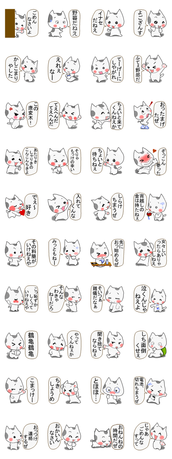 べらんめえニャンコ第二弾 BABOOmama コメントをどうぞ 粋でイナセなニャンコが、べらんめえ調(東京江戸下町方言)でしゃべるスタンプの第二弾が出来やした。お気に召しやしたら、是非とも使っておくんなせい。 このスタンプどう思う?!↓クリックで投票♪好き (0)かわいい (0)かっこいい (0)おもしろい (0)使いやすそう (0)欲しい (0)萌え (0)ほっこりする (0)おしゃれ (0)ゆるい (0)こわい (0)ウザい (0)キモい (0)ムカつく (0)持ってる (0)癒される (0)セクシー (0)個性的 (0)私は買わない (0)誰かプレゼントして! (0) 購入・プレゼントする Facebookでシェア Twitterでシェア