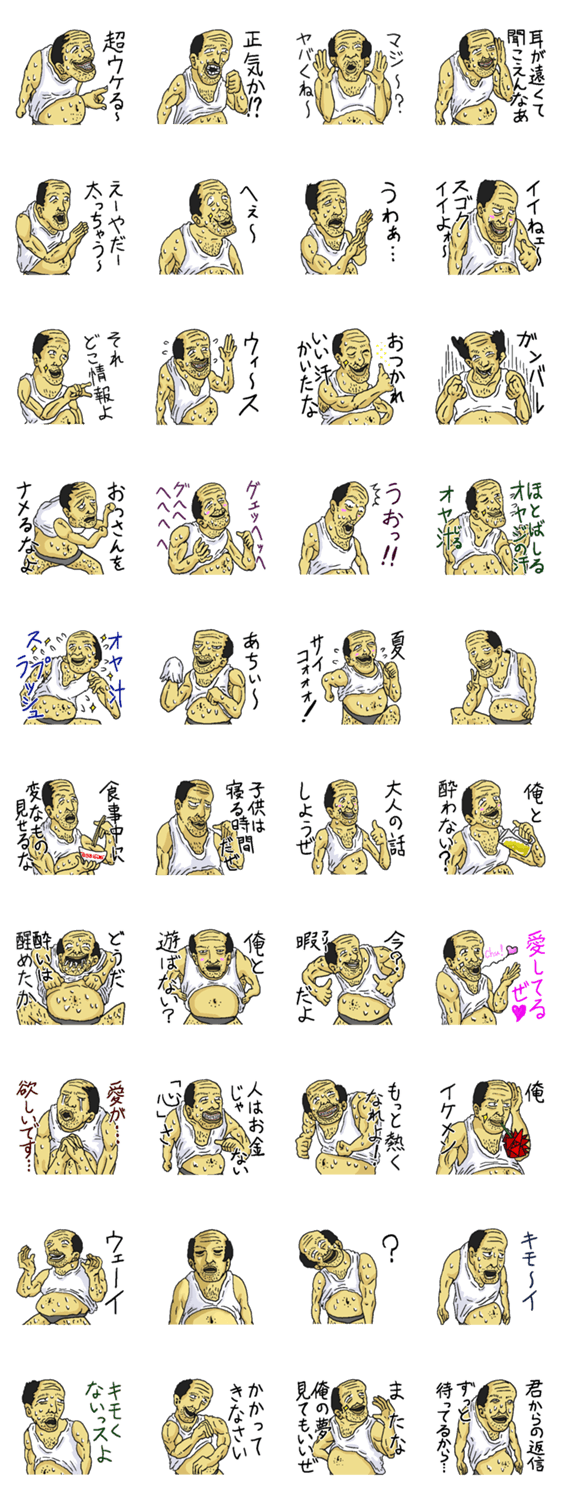ほとばしるオヤジの汗、オヤ汁。 第六排便魔王 コメントをどうぞ 汗したたるおっさんのスタンプです。ちょっとうざいかもしれません。 このスタンプどう思う?!↓クリックで投票♪好き (0)かわいい (0)かっこいい (0)おもしろい (0)使いやすそう (0)欲しい (0)萌え (0)ほっこりする (0)おしゃれ (0)ゆるい (0)こわい (0)ウザい (0)キモい (0)ムカつく (0)持ってる (0)癒される (0)セクシー (0)個性的 (0)私は買わない (0)誰かプレゼントして! (0) 購入・プレゼントする Facebookでシェア Twitterでシェア