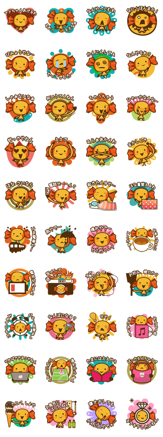 ほな、アメちゃんあげるわ~ ケンヤ・カセ コメントをどうぞ 飴に「ちゃん」を付けるほどフレンドリーな町、大阪。親しみやすさと人なつこさ、何より元気になれる大阪感満載の「アメちゃん」で、友達みんなに“笑顔”を送ろう。 このスタンプどう思う?!↓クリックで投票♪好き (0)かわいい (0)かっこいい (0)おもしろい (0)使いやすそう (0)欲しい (0)萌え (0)ほっこりする (0)おしゃれ (0)ゆるい (0)こわい (0)ウザい (0)キモい (0)ムカつく (0)持ってる (0)癒される (0)セクシー (0)個性的 (0)私は買わない (0)誰かプレゼントして! (0) 購入・プレゼントする Facebookでシェア Twitterでシェア