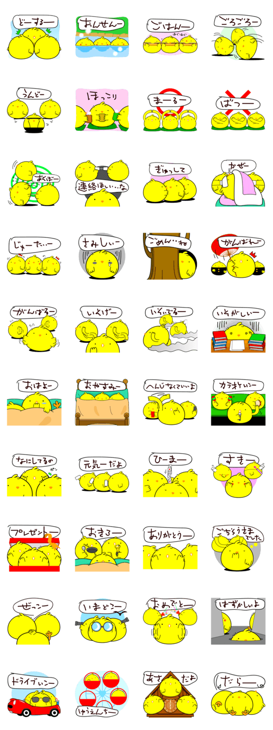 まんまるぴよぴよ JunEgu コメントをどうぞ まんまるの、可愛いひよこ三兄弟は、いつも一緒。ごはんを食べるときも寝るときも、いつも一緒の仲良し兄弟です。 このスタンプどう思う?!↓クリックで投票♪好き (0)かわいい (0)かっこいい (0)おもしろい (0)使いやすそう (0)欲しい (0)萌え (0)ほっこりする (0)おしゃれ (0)ゆるい (0)こわい (0)ウザい (0)キモい (0)ムカつく (0)持ってる (0)癒される (0)セクシー (0)個性的 (0)私は買わない (0)誰かプレゼントして! (0) 購入・プレゼントする Facebookでシェア Twitterでシェア