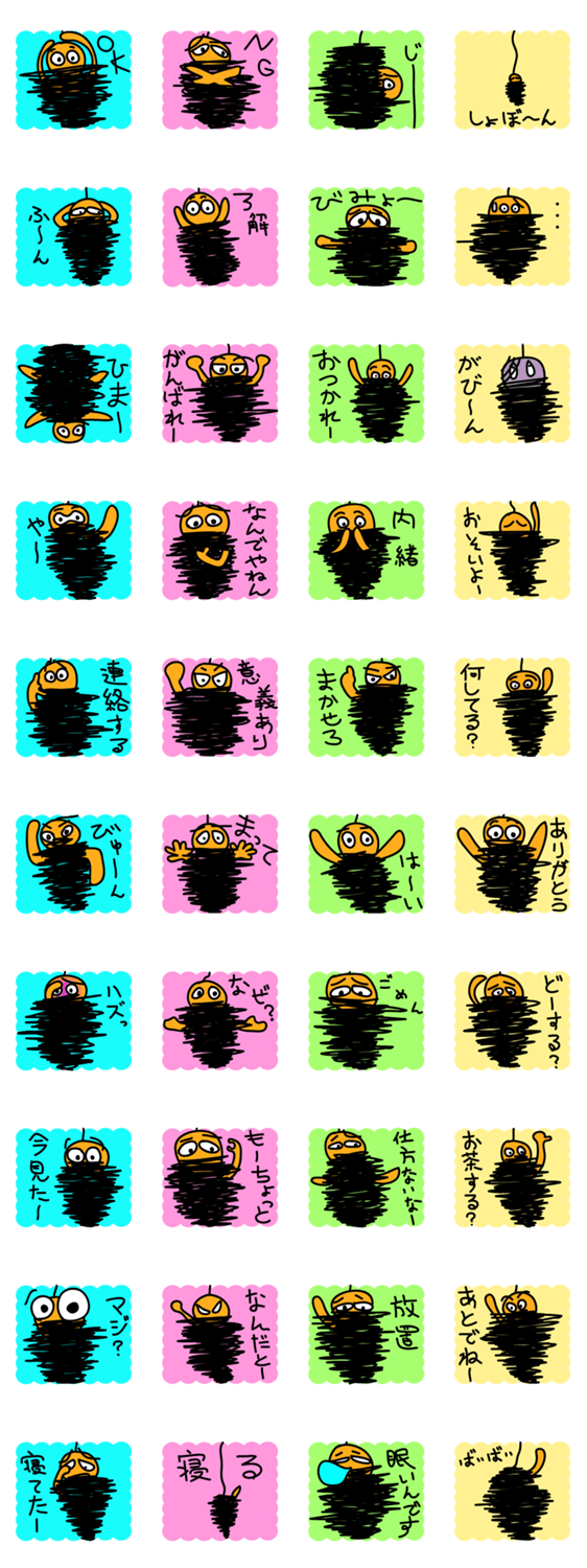 みの虫ゆんた ユンタ・ウェイ コメントをどうぞ ユンタが描いた夢のあるゆるキャラみの虫ゆんたが登場。みの虫ゆんたは日常会話を簡単に送れるスタンプです。 このスタンプどう思う?!↓クリックで投票♪好き (0)かわいい (0)かっこいい (0)おもしろい (0)使いやすそう (0)欲しい (0)萌え (0)ほっこりする (0)おしゃれ (0)ゆるい (0)こわい (0)ウザい (0)キモい (0)ムカつく (0)持ってる (0)癒される (0)セクシー (0)個性的 (0)私は買わない (0)誰かプレゼントして! (0) 購入・プレゼントする Facebookでシェア Twitterでシェア