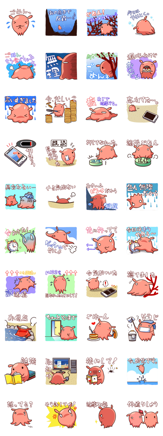 めんだこ村のゴメンダコ めんだこ村☆しゃのあ~る。 コメントをどうぞ 不思議可愛い深海生物メンダコたんが、あなたに変わって「ごめんね」してくれます。 このスタンプどう思う?!↓クリックで投票♪好き (0)かわいい (0)かっこいい (0)おもしろい (0)使いやすそう (0)欲しい (0)萌え (0)ほっこりする (0)おしゃれ (0)ゆるい (0)こわい (0)ウザい (0)キモい (0)ムカつく (0)持ってる (0)癒される (0)セクシー (0)個性的 (0)私は買わない (0)誰かプレゼントして! (0) 購入・プレゼントする Facebookでシェア Twitterでシェア