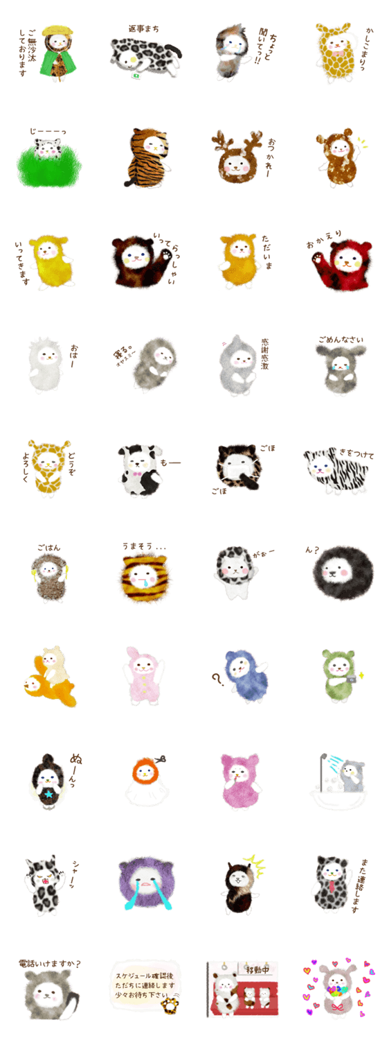 もふもふ -アニマル編- Kuniyo コメントをどうぞ モフモフファーのアニマルバージョン。ヒョウ柄、ゼブラ、トラ、鹿、キリン、くまのカラフルな毛皮をまとったモフモフふわふわな動物達。日常会話、あいさつメッセージ用。 このスタンプどう思う?!↓クリックで投票♪好き (0)かわいい (0)かっこいい (0)おもしろい (0)使いやすそう (0)欲しい (0)萌え (0)ほっこりする (0)おしゃれ (0)ゆるい (0)こわい (0)ウザい (0)キモい (0)ムカつく (0)持ってる (0)癒される (0)セクシー (0)個性的 (0)私は買わない (0)誰かプレゼントして! (0) 購入・プレゼントする Facebookでシェア Twitterでシェア